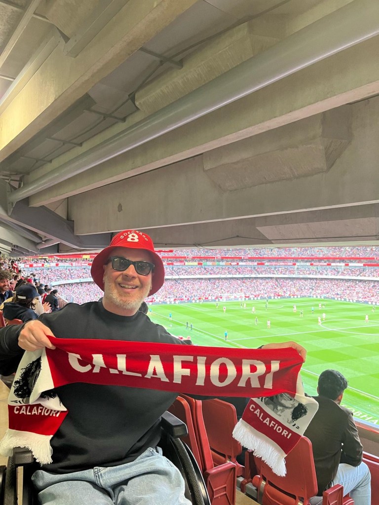 «Per questo 40º compleanno ho deciso di affrontare questo viaggio in Inghilterra, andando a trovare i miei cugini che vivono da 9 anni lì e quindi ho colto la palla al balzo e ho deciso di partire da Pescara e di festeggiare il mio quarantesimo compleanno, mercoledì 9 aprile, a Londra. Avevo l’intenzione di andare a vedere Arsenal-Madrid che però purtroppo si è giocata il martedì (8 aprile), io ero in viaggio e non ci siamo riusciti, però per compensare sono andato a vedere Tottenham-Eintracht Francoforte e Arsenal-Brentford. Questo lo devo a degli amici che lavorano nel mondo del calcio che mi hanno ospitato. Al Tottenham Stadium sono stato ospite di Guglielmo Vicario, mentre sabato all’Emirates di Riccardo Calafiori. In tutto ciò, il venerdì sono andato anche a fare un tour dello Stamford Bridge. Ho visto tutto il museo: un’enorme emozione, soprattutto vedere la maglia di Luca Vialli negli spogliatoi del Chelsea: mi ha dato una certa emozione. E vedere la maglia di tutti i giocatori più famosi della storia del calcio e vedere “il mio” Paolo Maldini anche lì mi ha dato un’altra emozione immensa. Per quanto riguarda gli stadi, il Tottenham Stadium è bellissimo, è davvero uno stadio moderno, imponente, nel quale appena sono entrato mi ha lasciato senza parole, senza fiato… è una cosa che davvero ti lascia così, basito. È enorme. Poi c’è un clima bellissimo. Noi ragazzi in carrozzina veniamo messi in alto e c’è anche la moquette sotto. Poi c’è il QR code che puoi scannerizzare e ti portano una bevanda o un hotdog direttamente nella tua possazione. È pazzesco a livello di modernità, una cosa che consiglio a tutti se ne hanno la possibilità. D’altronde lo definiscono tra i primi tre stadi d’Europa.